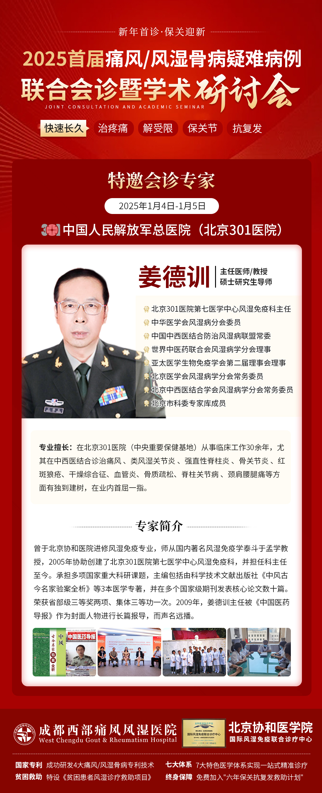 2025新年即将到来,为推动我国痛风、风湿骨病的发展和进步,加强风湿免疫科学界的学术交流,由北京协和医学院风湿免疫联合诊疗中心主办、我院承办的“2025首届痛风/风湿骨病疑难病例联合会诊暨学术研讨会”将于