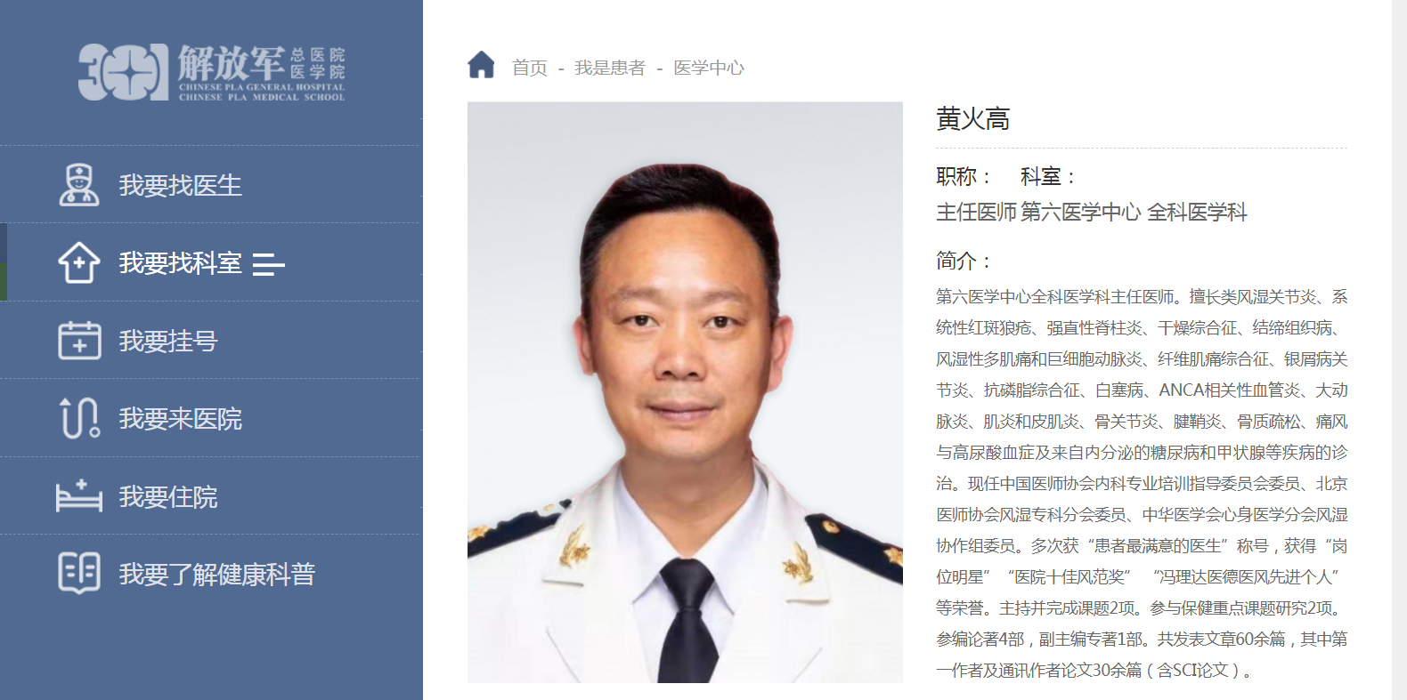 中国人民解放军总医院第六医学中心风湿免疫科创始人之一